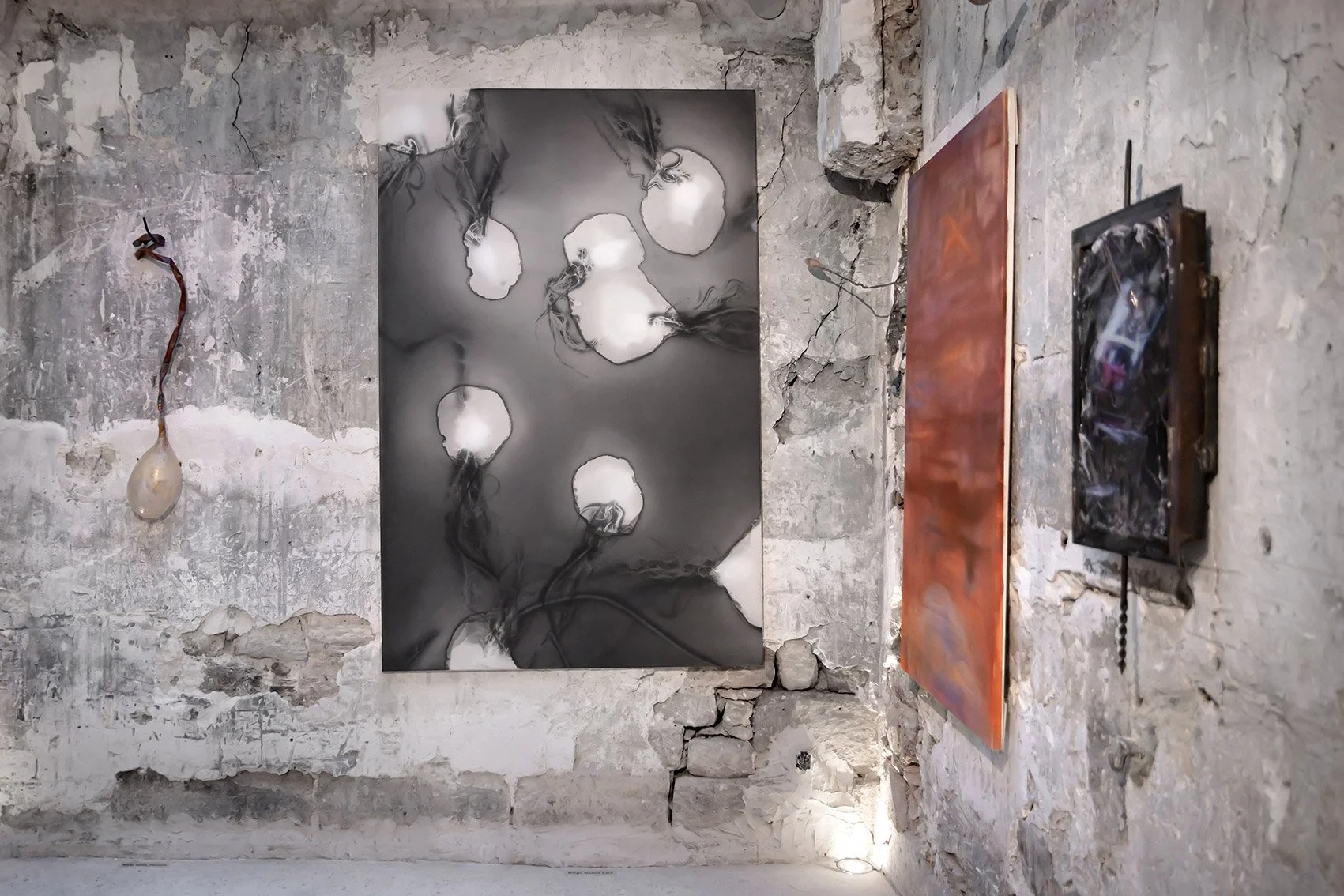 Mexican by origin and son of two micro-paleontologists and professors, his native culture and his education from a scientific background quickly became a major source of inspiration for the artist. Never taken out of the studio and pre- sented for the first time in a group exhibition, the Medusa diptych is part of a series of works on canvas entitled Fleuve, begun in 2021. It is a testimony, an attraction or rather a fascination that Lara has for the organic element, water.