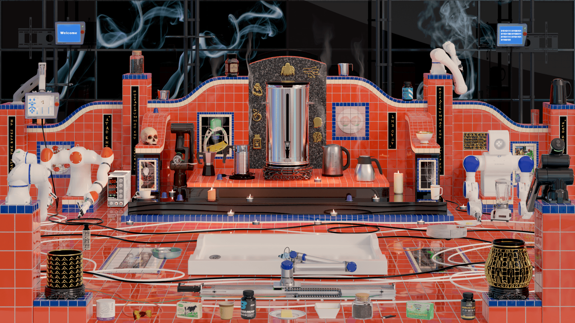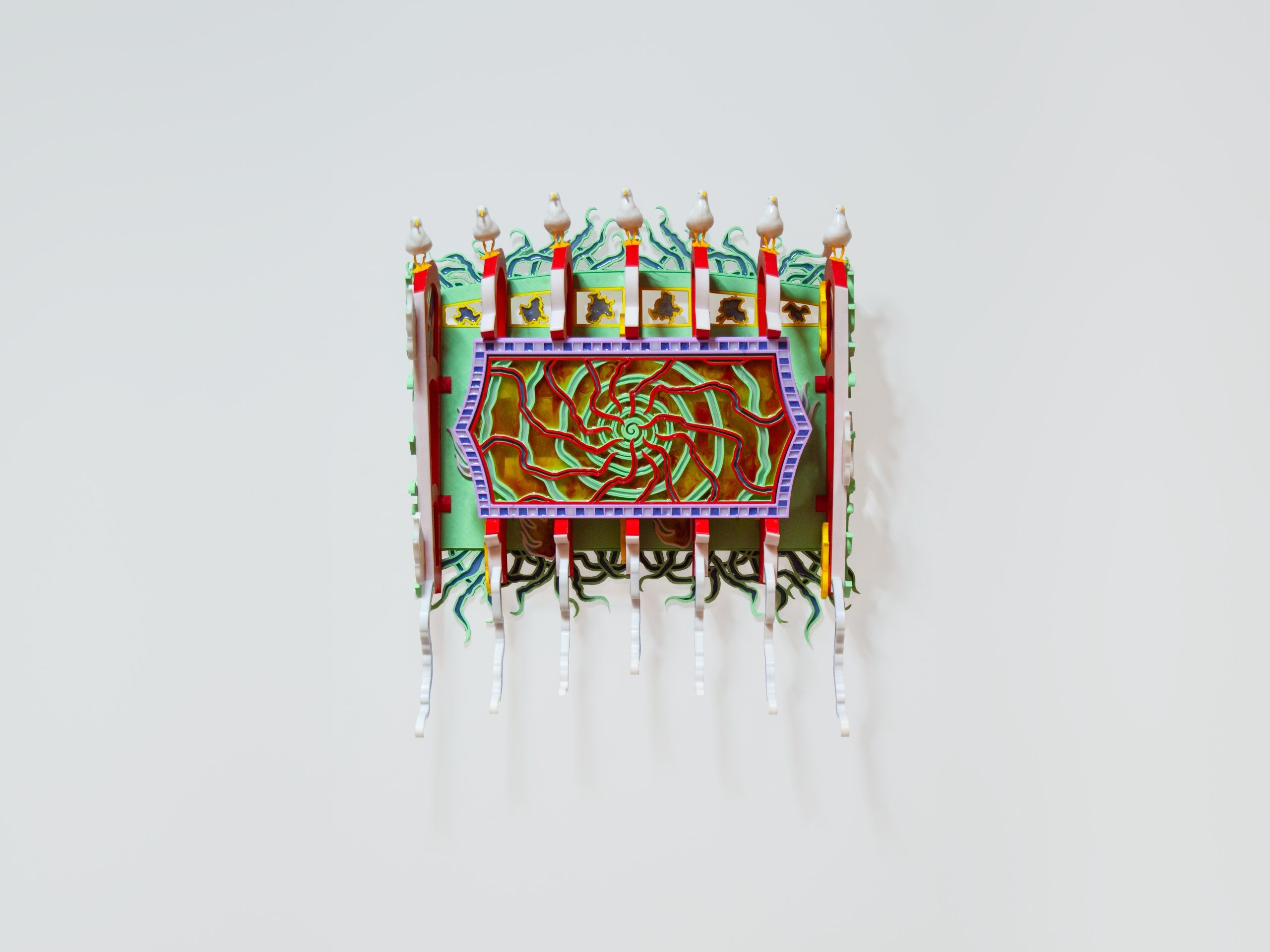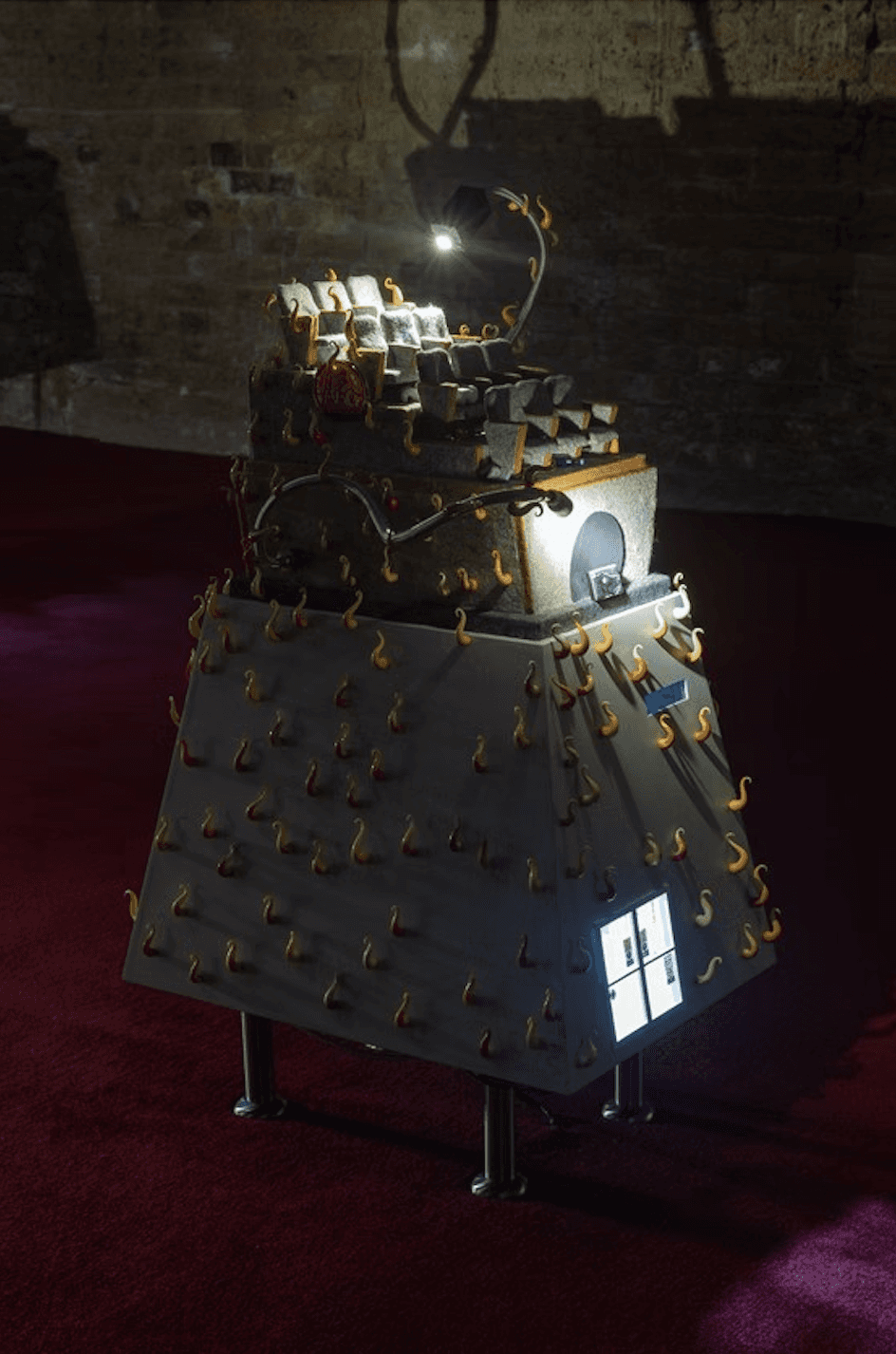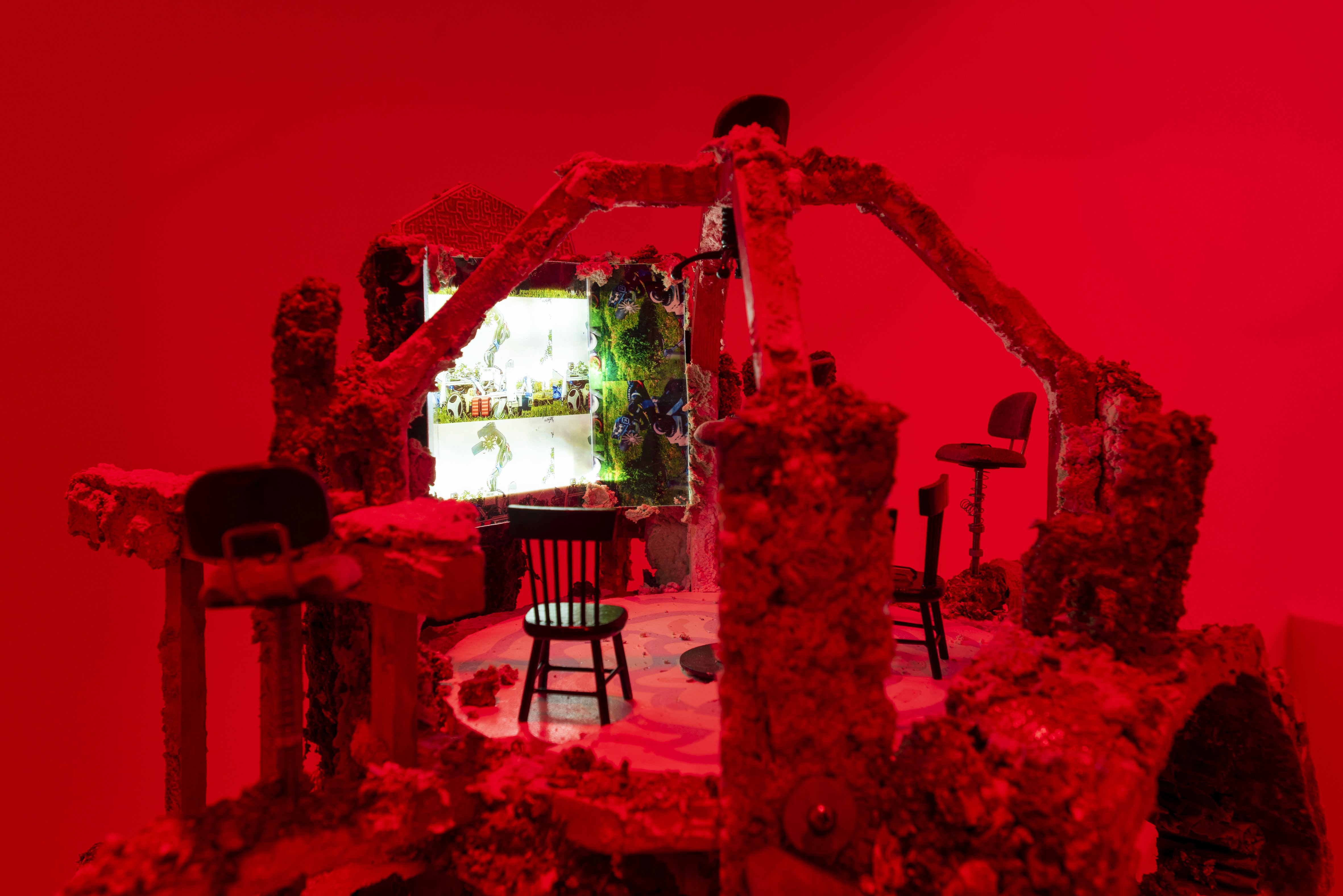 PLA, resin, polymer clay, digital print, carpet, felt, cardboard, LEDs, 34 × 24 × 14 cm.