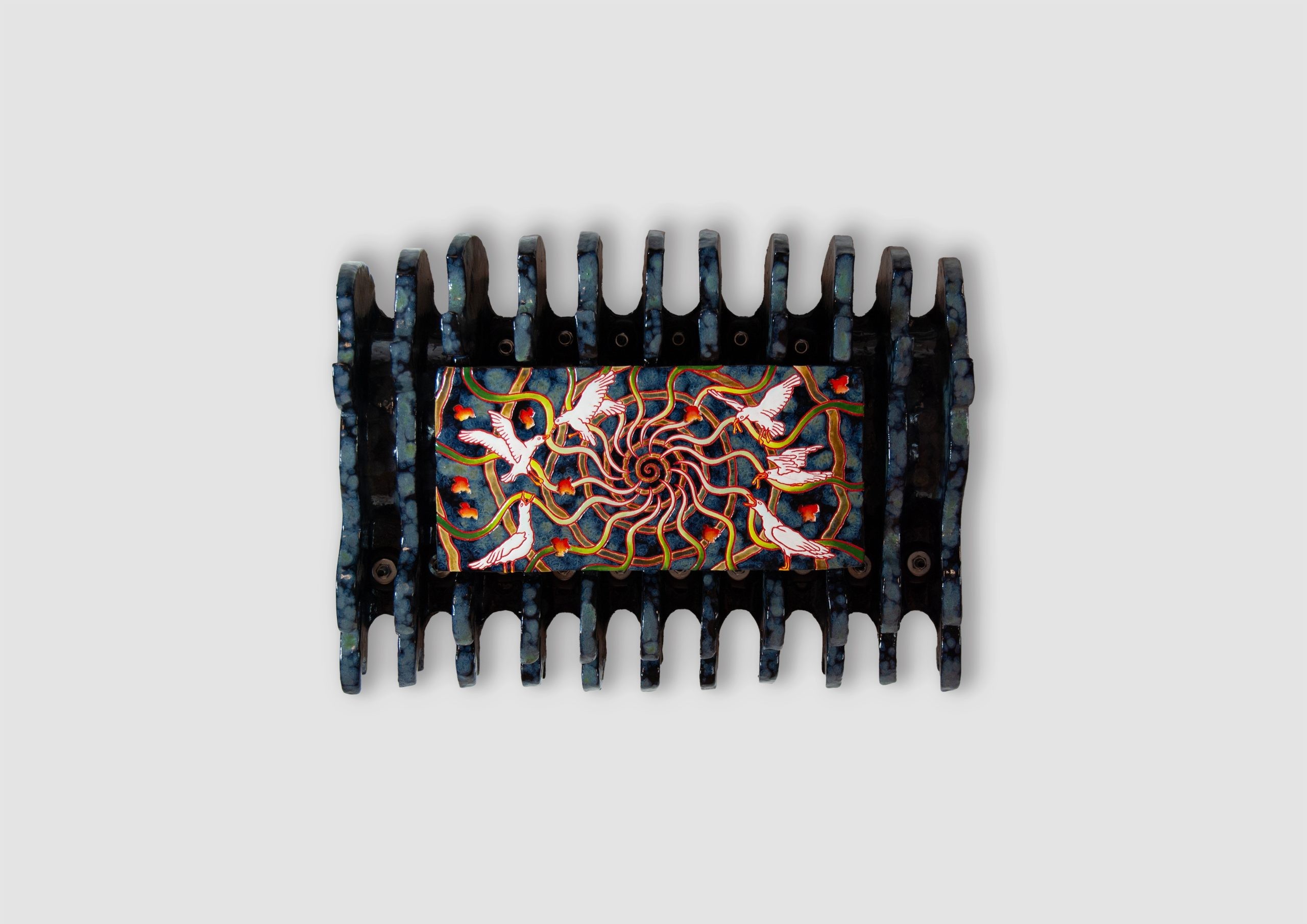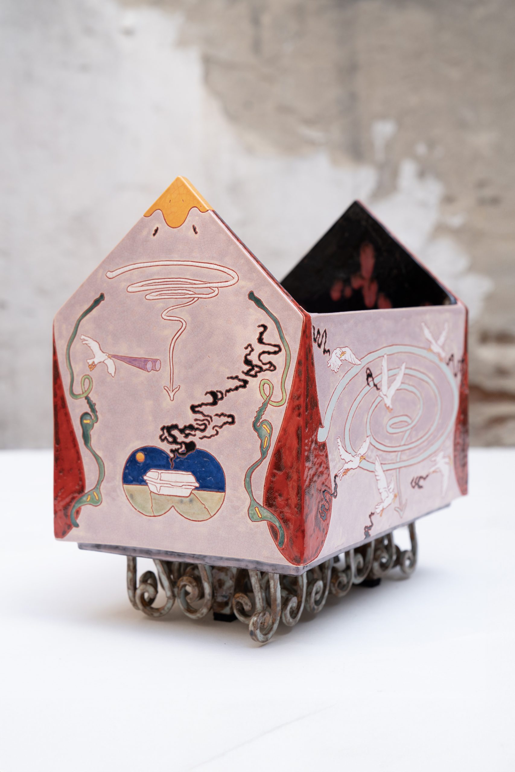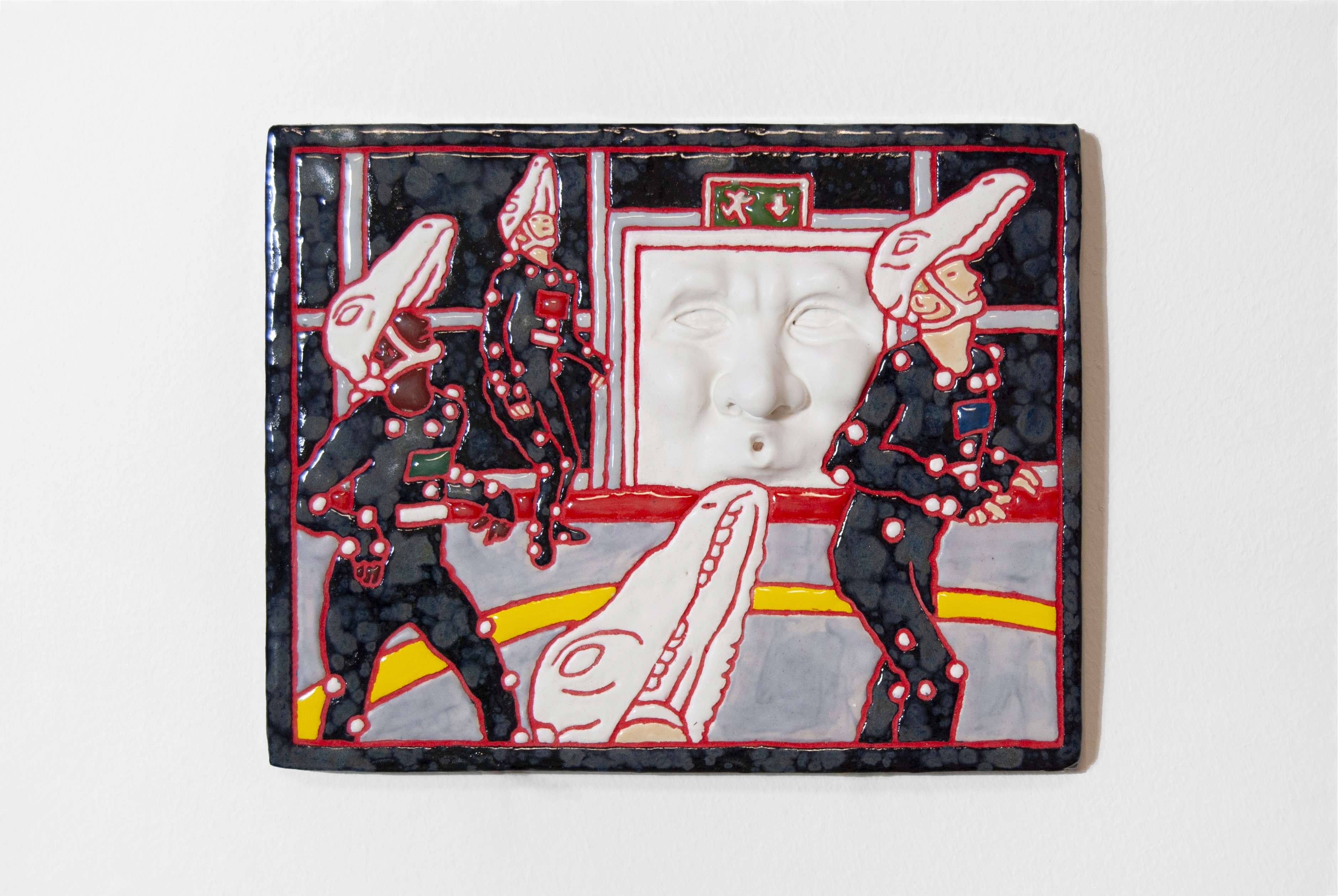 Glazed ceramic, pigment, grout, metal, 32 × 42 × 15 cm