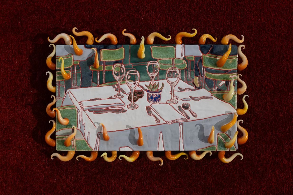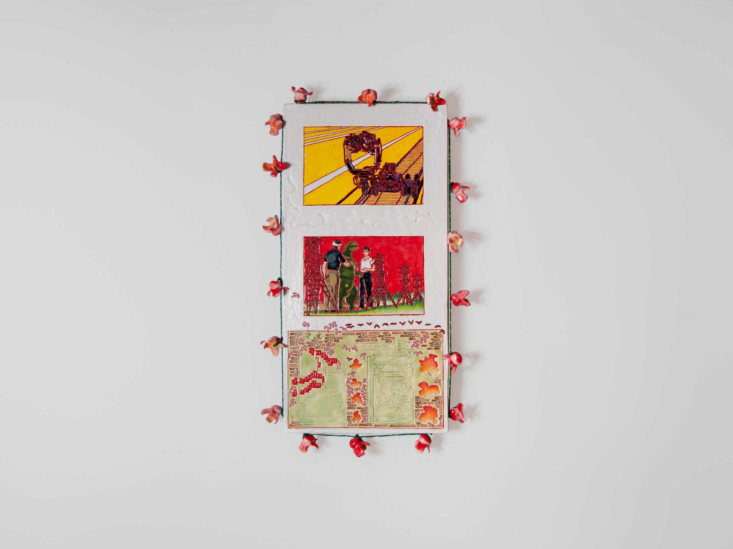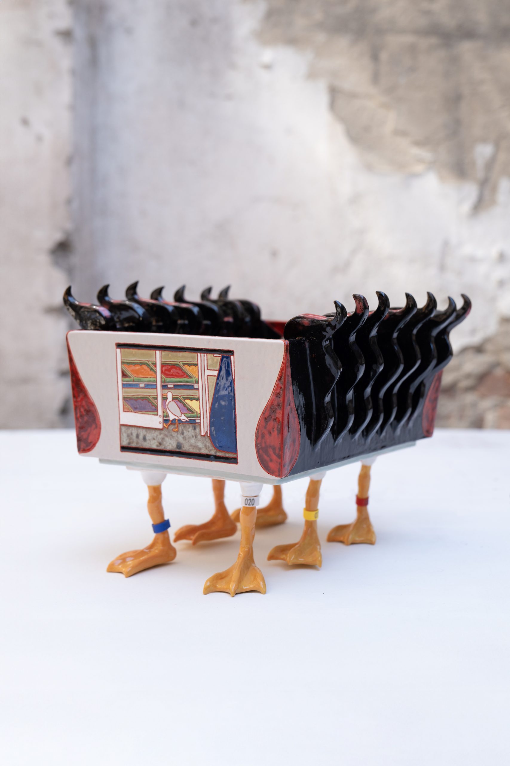 Glazed ceramic, pigment, grout, metal, 32 × 42 × 15 cm