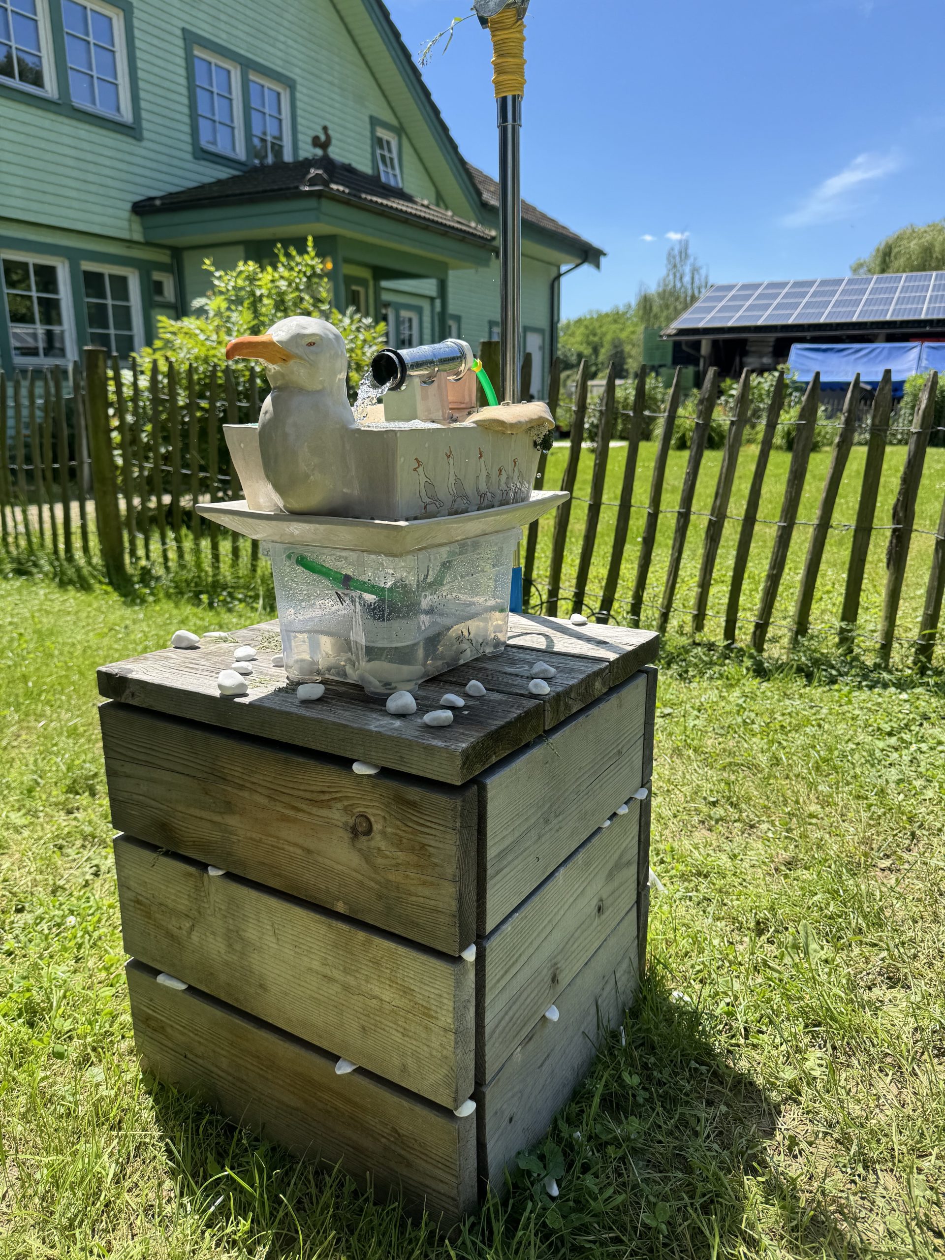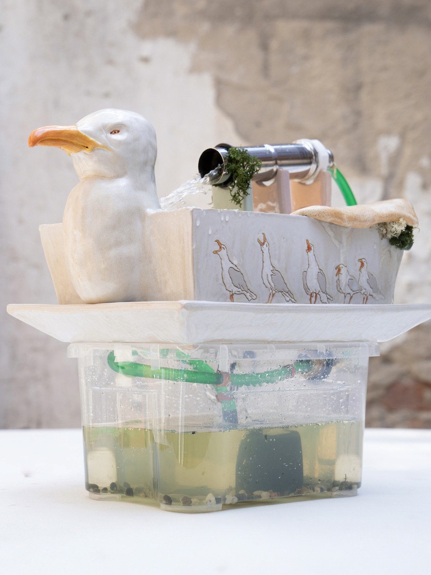 Glazed ceramics, grout, pump, metal pipe, pvc hose, plastic box, water, 35 × 35 × 24 cm.