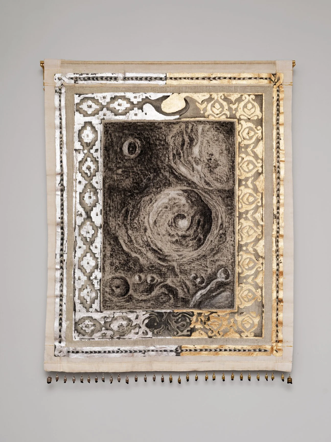 Emilia Estrada, Al-Bakri, 2025, From the series ‘Andalucia’, Charcoal, soft pastel, gold leaf, brass, and basalt on linen, 100 × 80 cm. Photo: Aurélien Mole. Courtesy of the artist and Hatch Gallery.