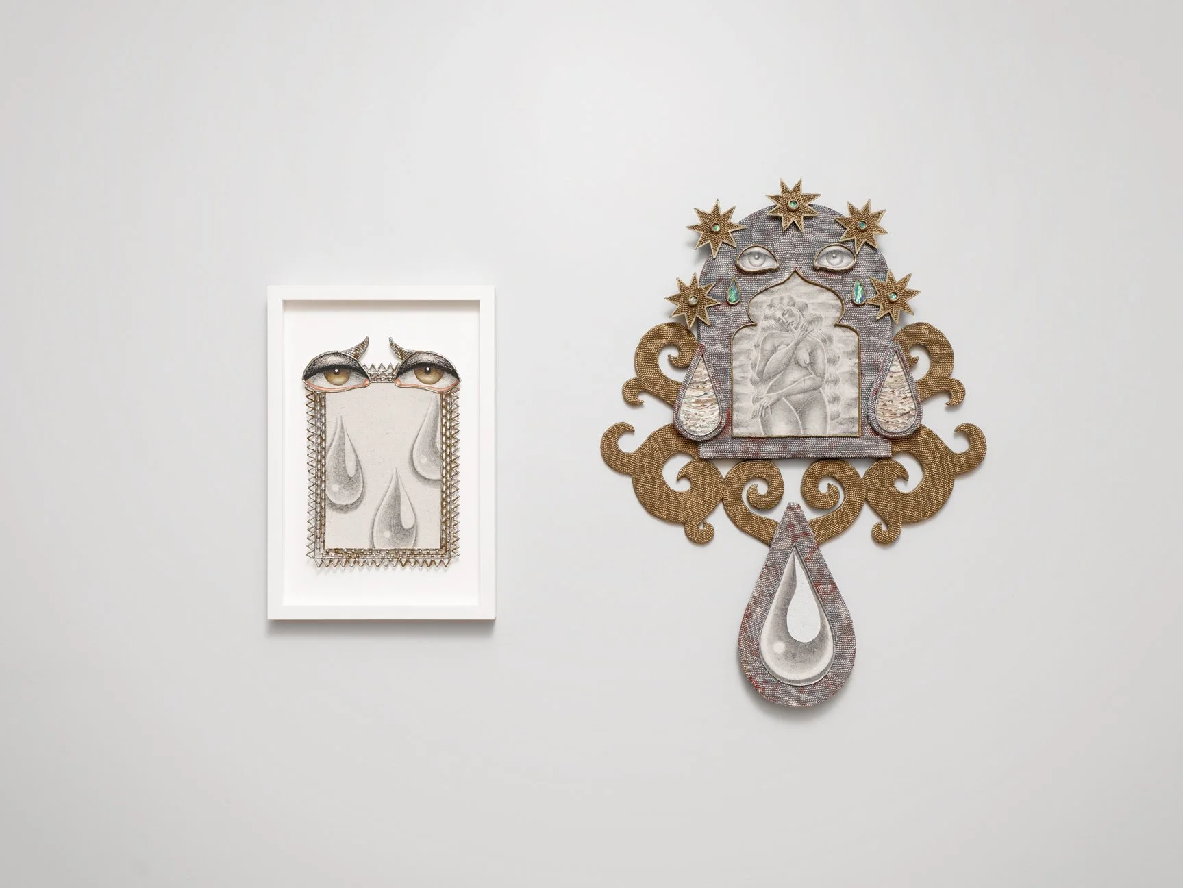 Zayn Qahtani, Universal Shrine for Grieving, 2023, Gilt polylactide, abalone shell, graphite, bahraini date palm paper, 83 x 61 cm. Courtesy of the artist and Hatch Gallery.