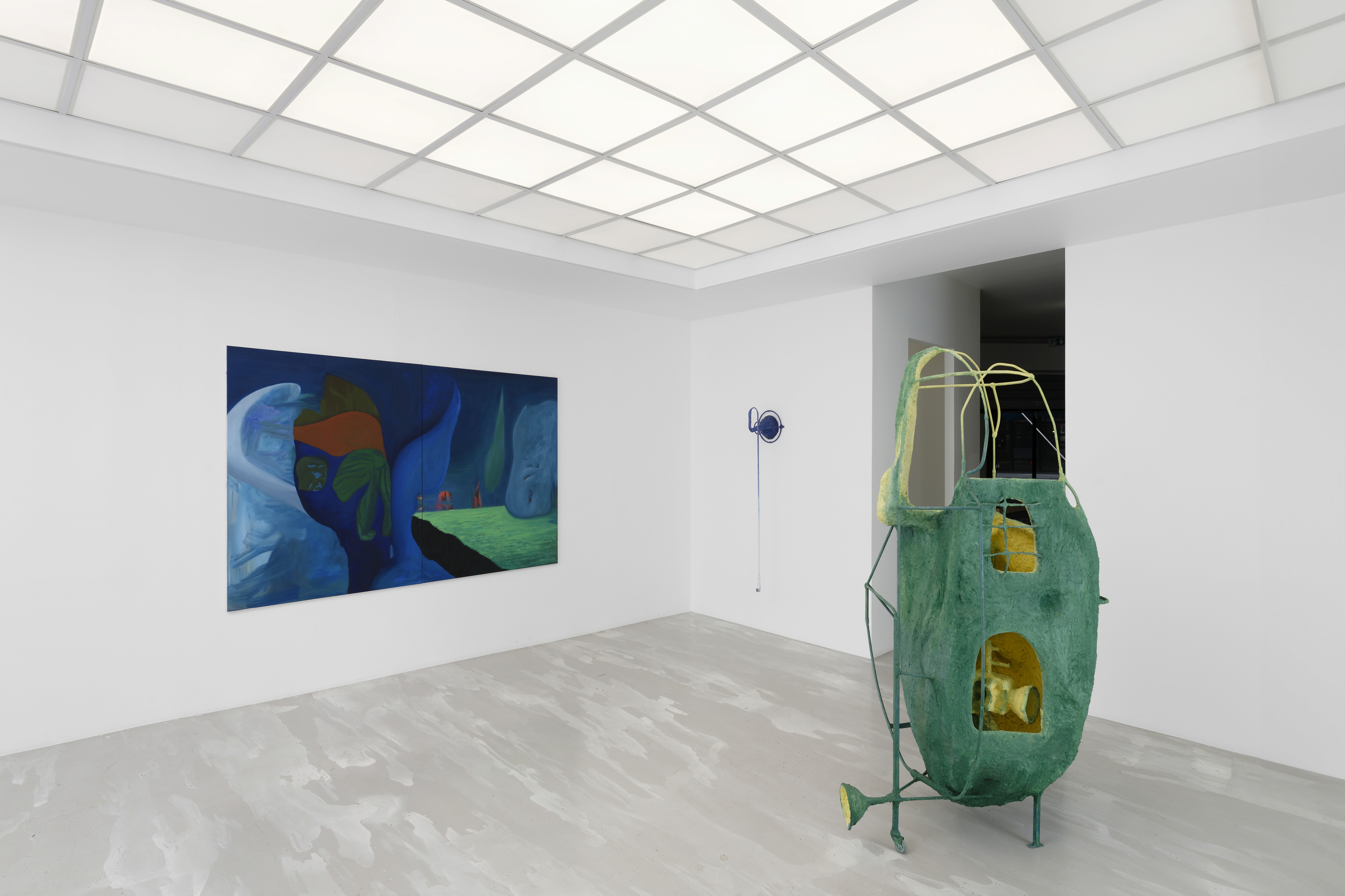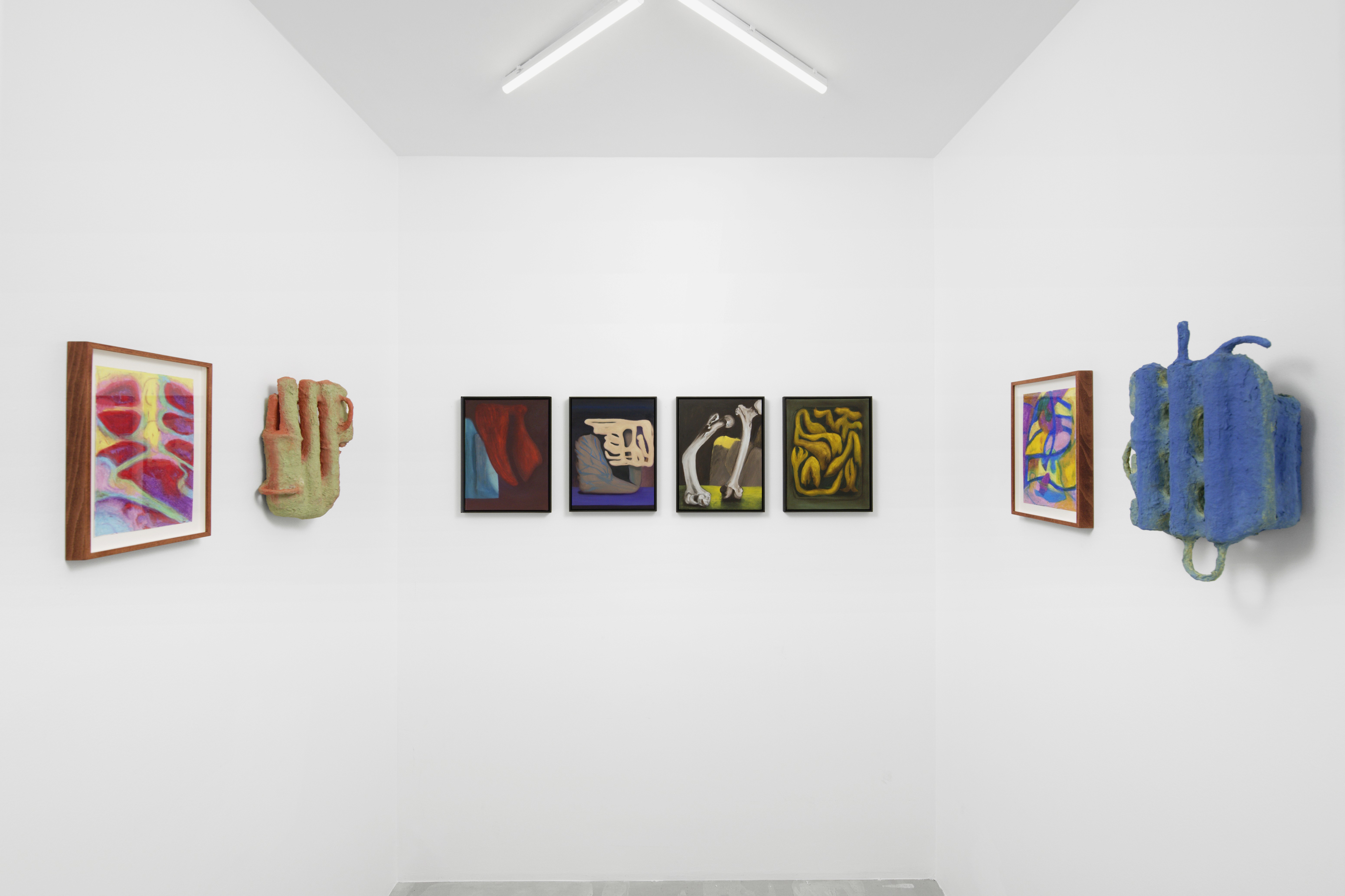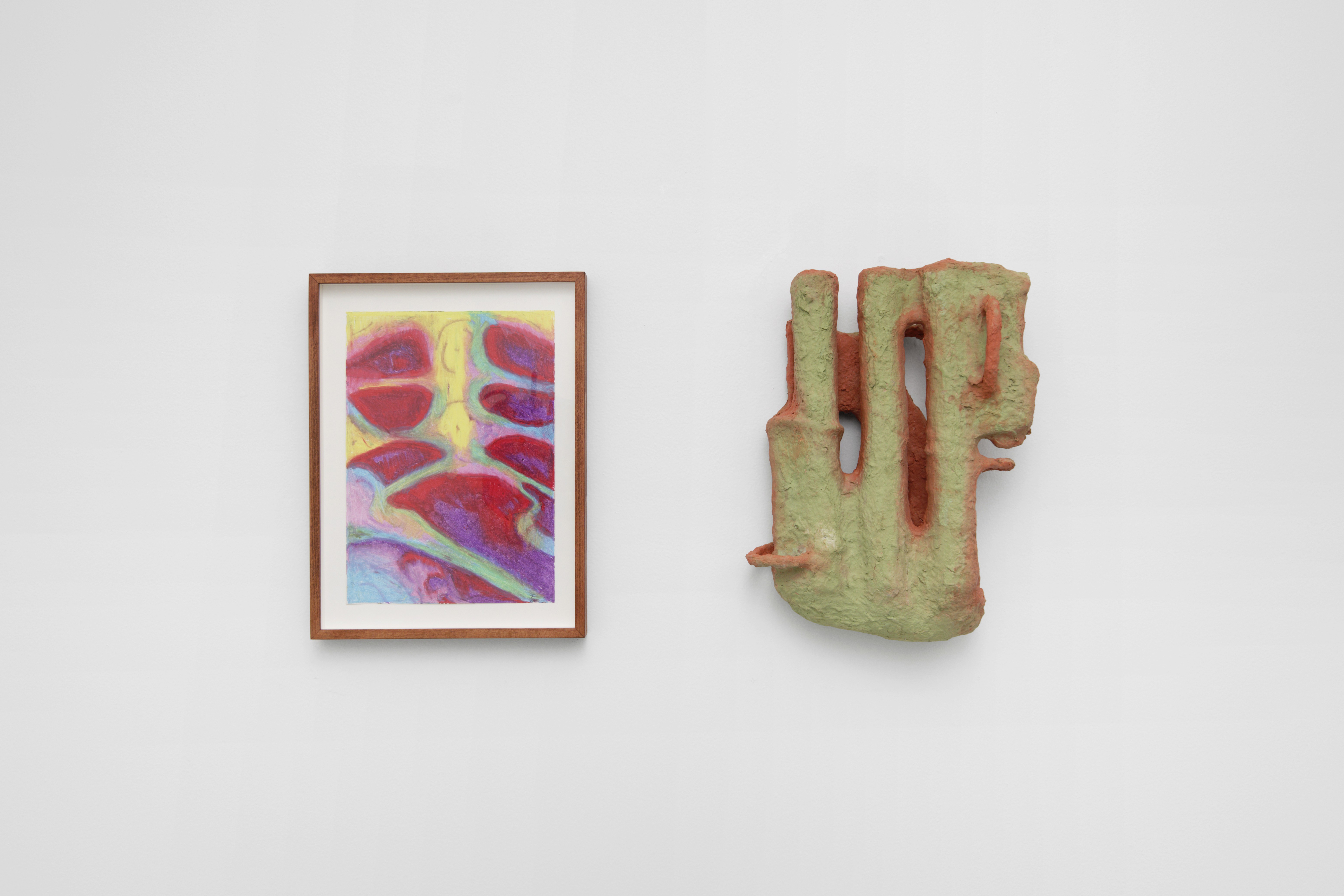 In the works of both artists, the interest in sometimes highly intense chromatic impact, the fondness for the familiar and intriguing, as well as the junction between body, landscape, and structures, engage in a dialogue with the legacies of surrealism. ‘Confab Window’ translates their shared attention to the effects of thresholds, in-betweens, and the processes of instability that these circulations generate in their practices. The title of the exhibition also refers to the shared period of time between them and the continuation of this conversation among the works in the exhibition. New productions are presented alongside existing works in the gallery's alcoves, which are conducive to thoughtful contemplation. Here, one discovers works stemming from peripheral practices of the artists: a series of drawings for Olivia Bax and a ceramic piece for Veronika Hilger.