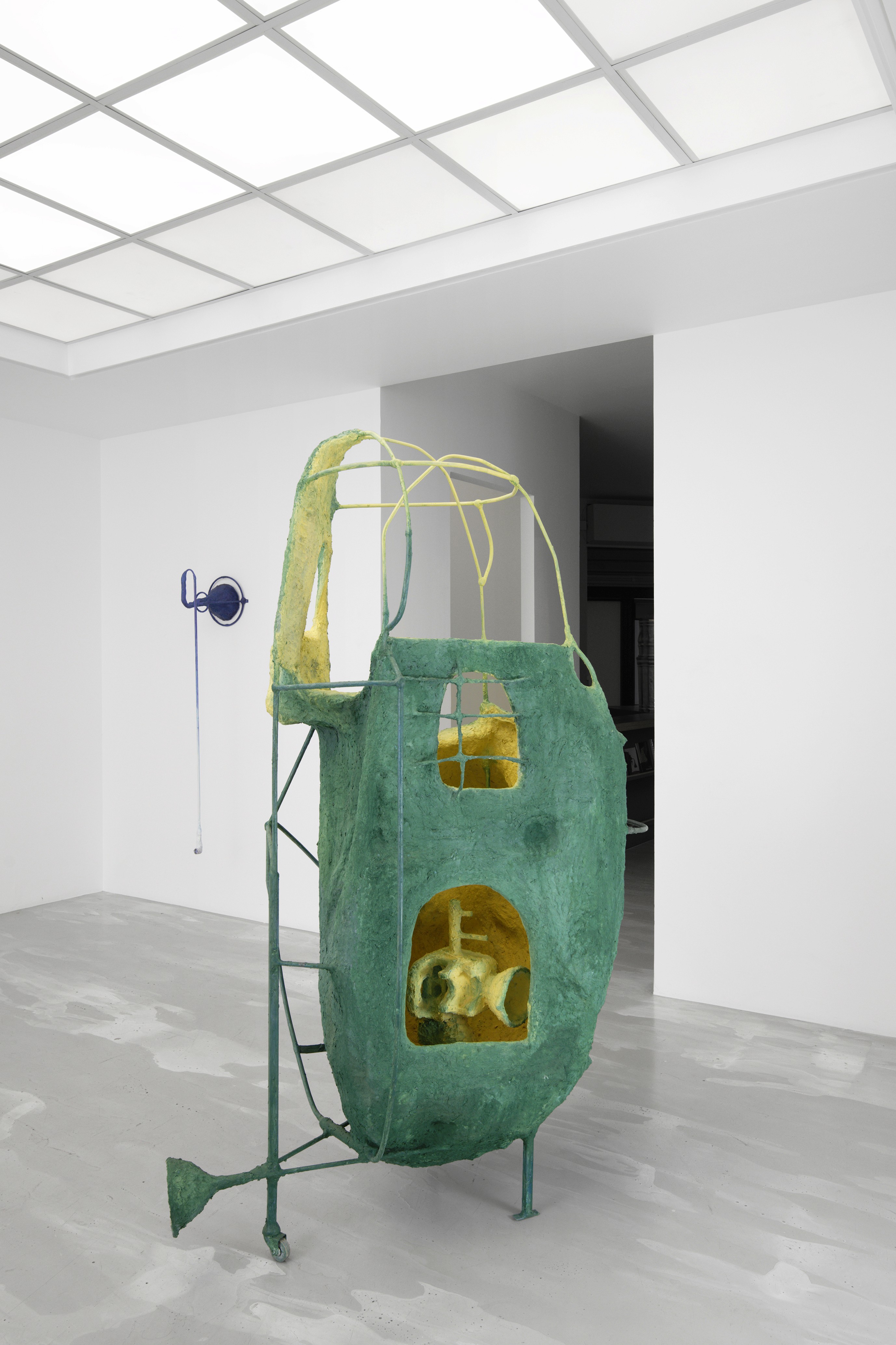 In the works of Bax and Hilger, there is a shared desire to explore liminal spaces that open pathways between interior and exterior, objectivity and subjectivity. Bax's sculptural environments oscillate between systems and characters, serving as both containers and figures imbued with personality. This is exemplified in Oriel (2023), a new production that emphasizes the deployment of a hollow space within the artist's sculptures. Her fascination with architectural sedimentation and borrowings from functional objects is also expressed through the emergence of windows. Once equipped with pockets or nests, her sculptures have now become architecture, allowing the viewer's gaze to pass through. The internal space is as significant as the protruding elements of the framework or texture, revealing a second sculptural level that is not immediately apprehensible to the eye.