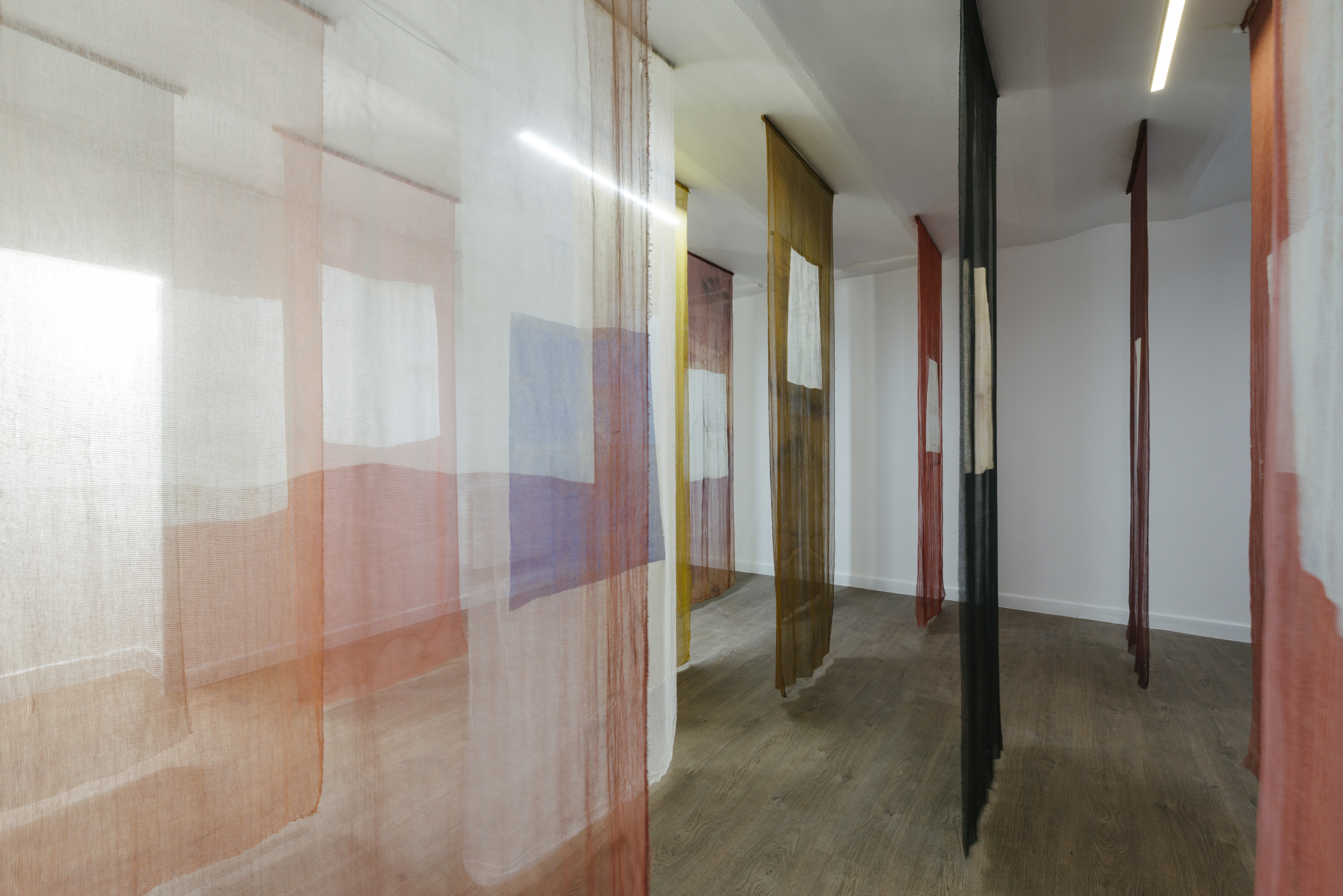 Colours and shapes and colours and shapes and more COLOURS AND SHAPES are Maria’s premises to transmute these thoughts into bodily sensations. A simple process of the mathematical formula called intuition: a sensibility of the artistic practice that produces its own instructions, visual orders and optical rules. The red is placed next to the yellow and these two colours merge perfectly into orange, as if they were the product of scientific phenomena. These works are the result of a time of reflection and observation, but mostly of chromatic experimentation. Colour only exists because of the presence of light, so, do you see these colours? Search for it! Look through its transparencies, do you see these colours? Boom, light! You are in the presence of light! Is There Yet Space For Light allows these ethereal elements to lead the way to a new renaissance of thinking through simple pockets of clarity.