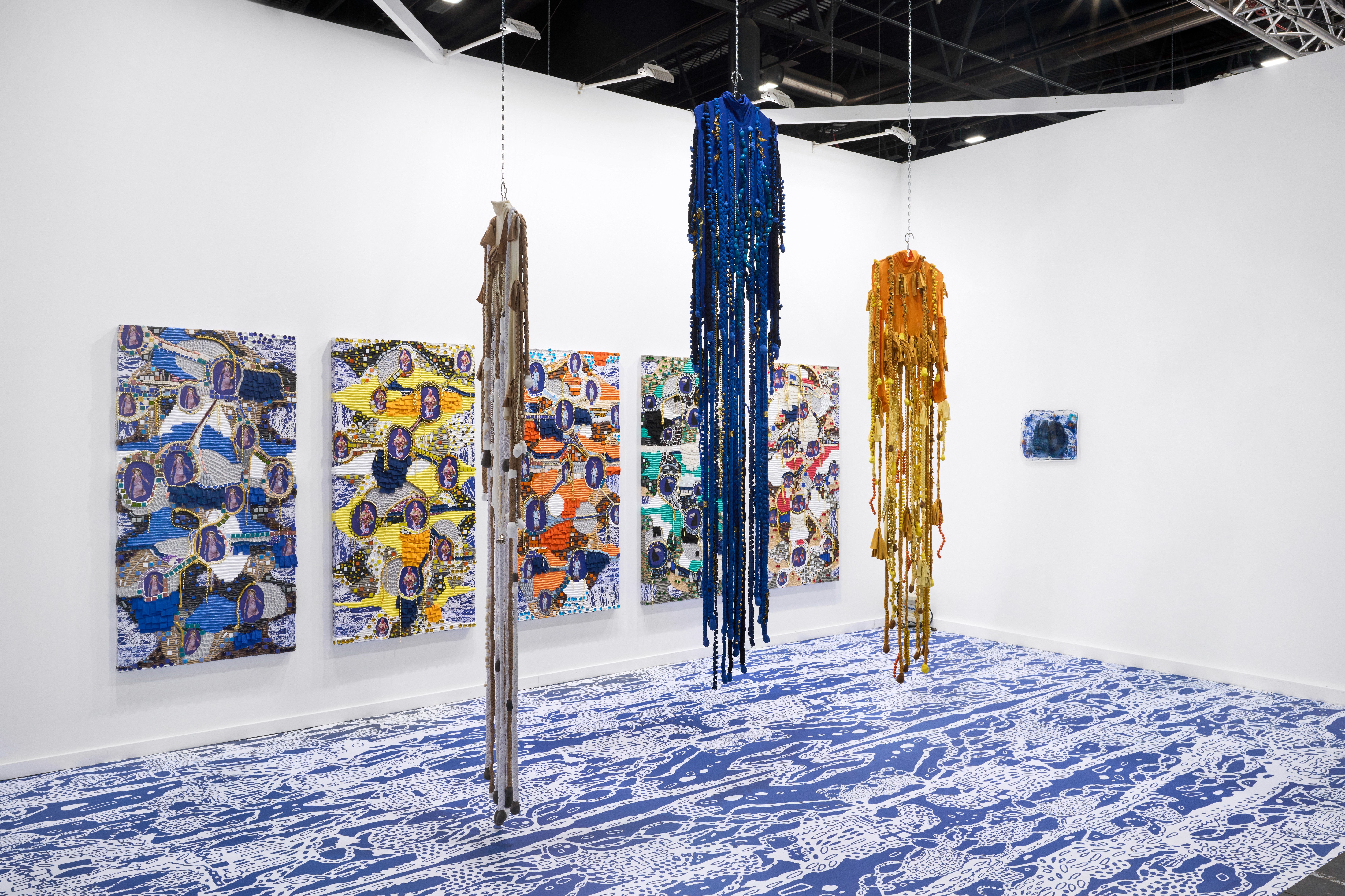 Specially conceived for ARCOmadrid 2025, With the Floats is a site-specific installation inspired by Junkanoo, a Caribbean masquerade tradition born from colonial resistance. Comprising five sculptural panels, three wearable costumes, and a large floor print, this immersive presentation creates a dynamic connection of references— water, land, and body—where materiality and history intertwine, positioning the body as both a network and a site of transformation. Through this installation, Weber reimagines Carnival as a space of resistance, reinvention, and collective storytelling —where bodies, traditions, and histories remain in perpetual transformation.