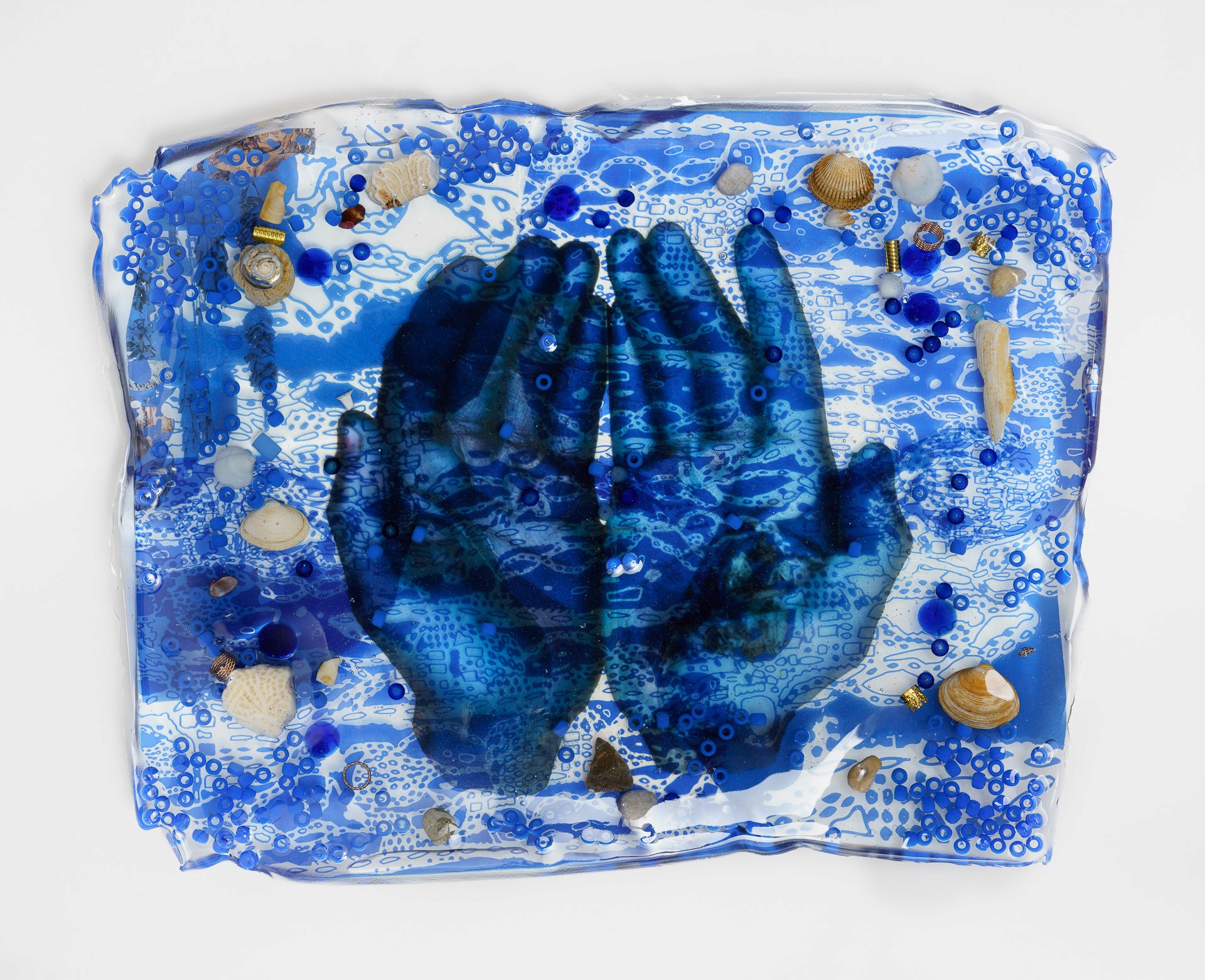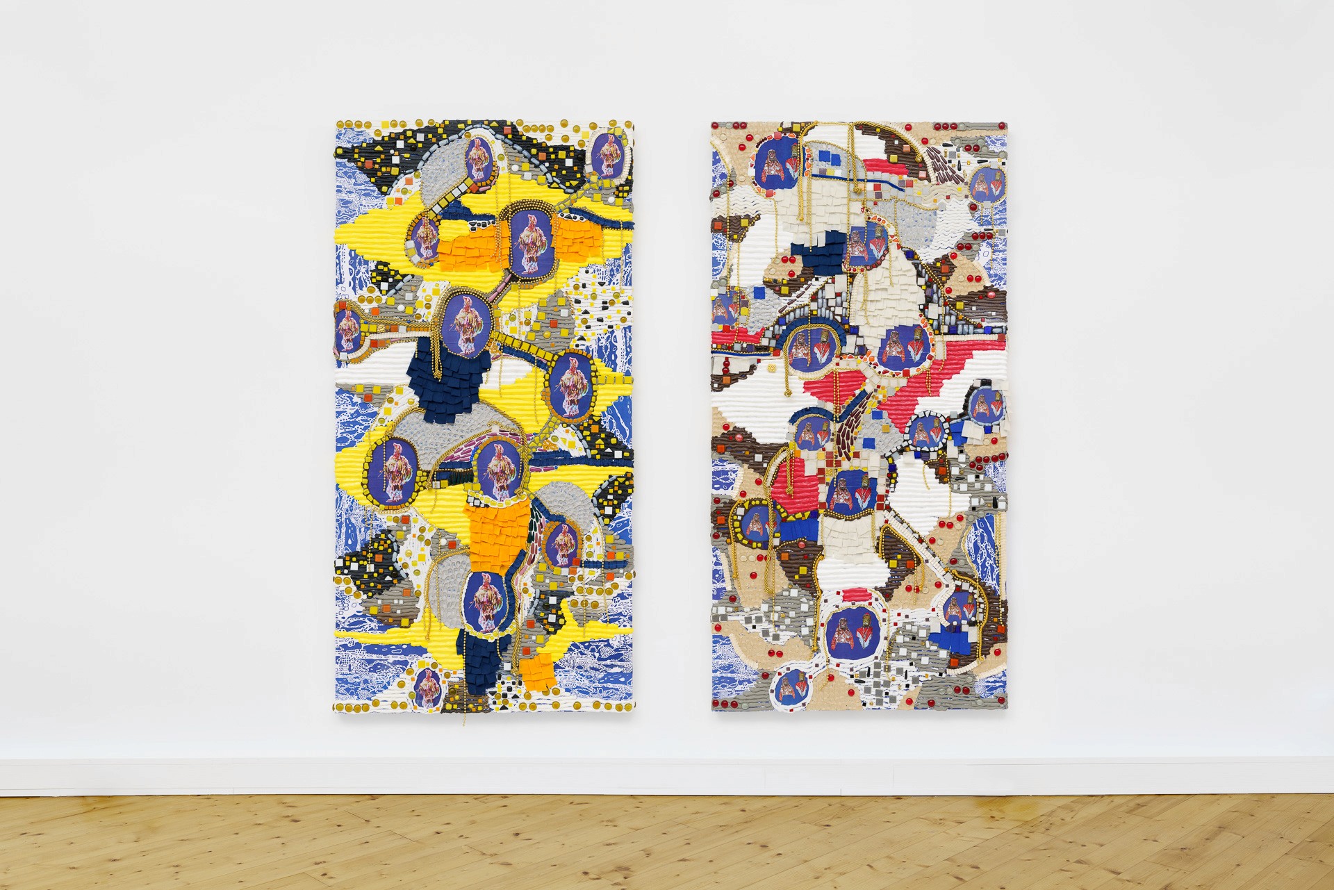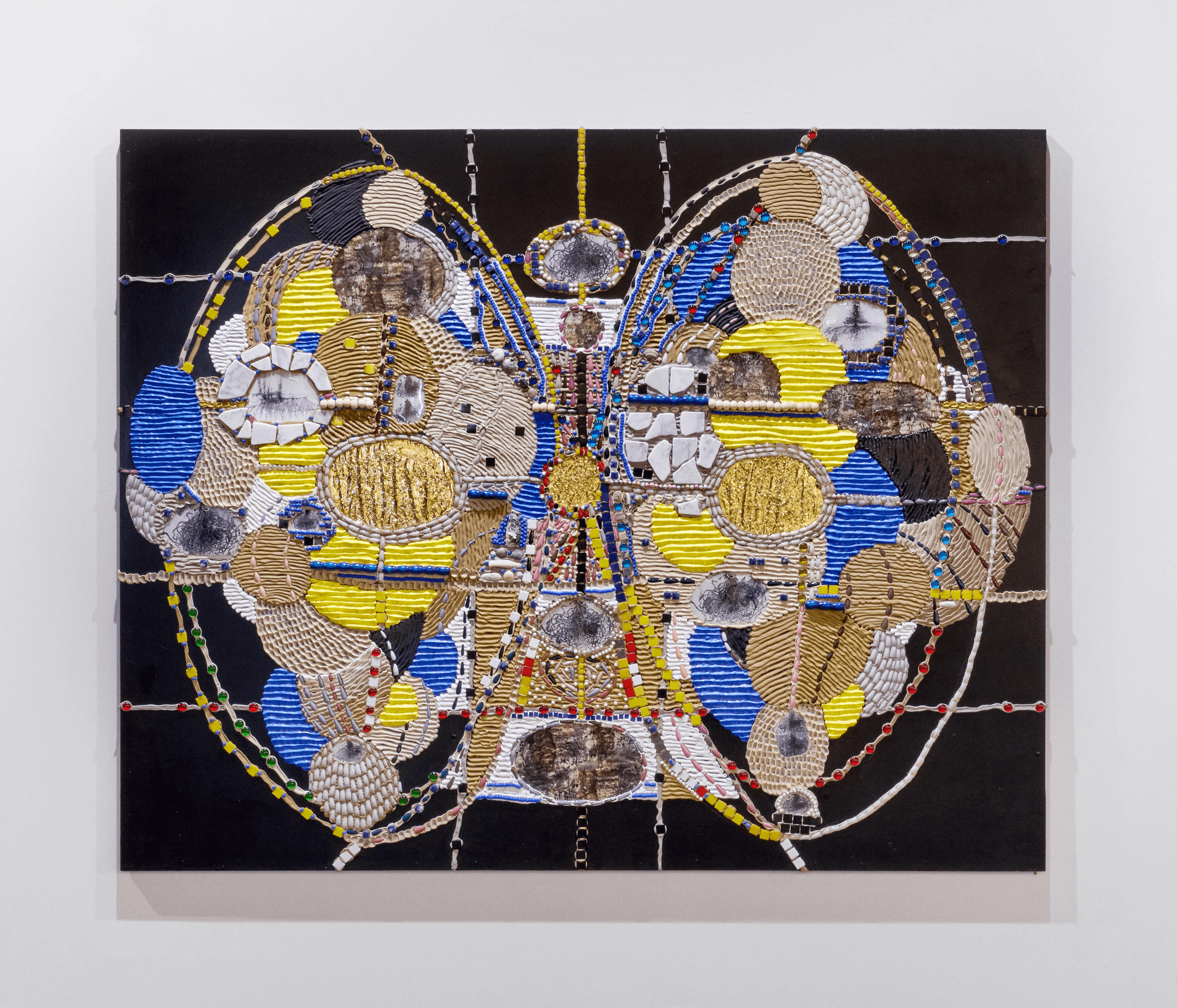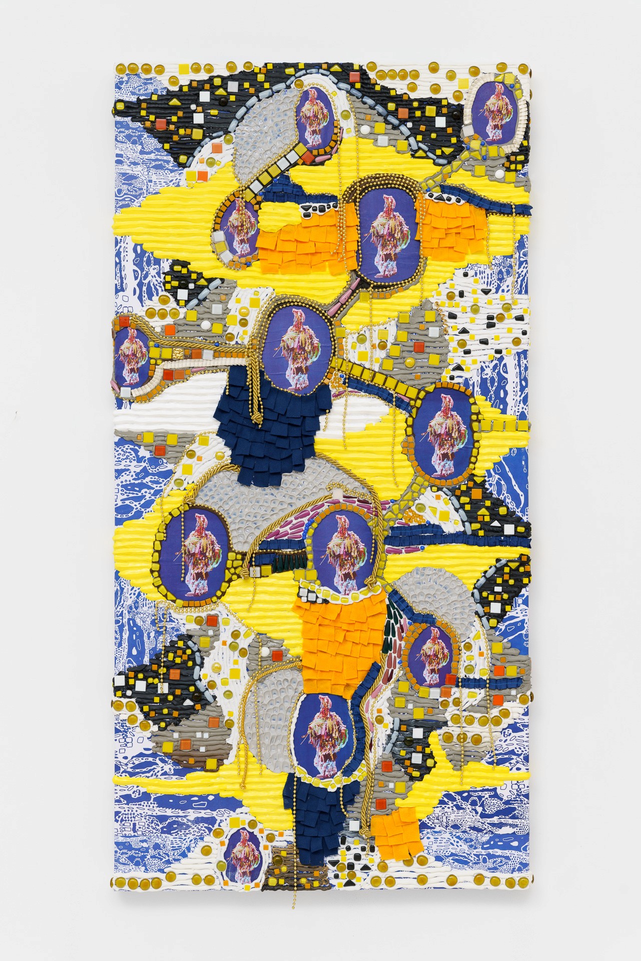 Silicone, acrylic paste, foam clay, acrylic paint, rope, fabric, pearls, clips, acrylic nails, chain clay, print on wood board, 160 x 80 cm.