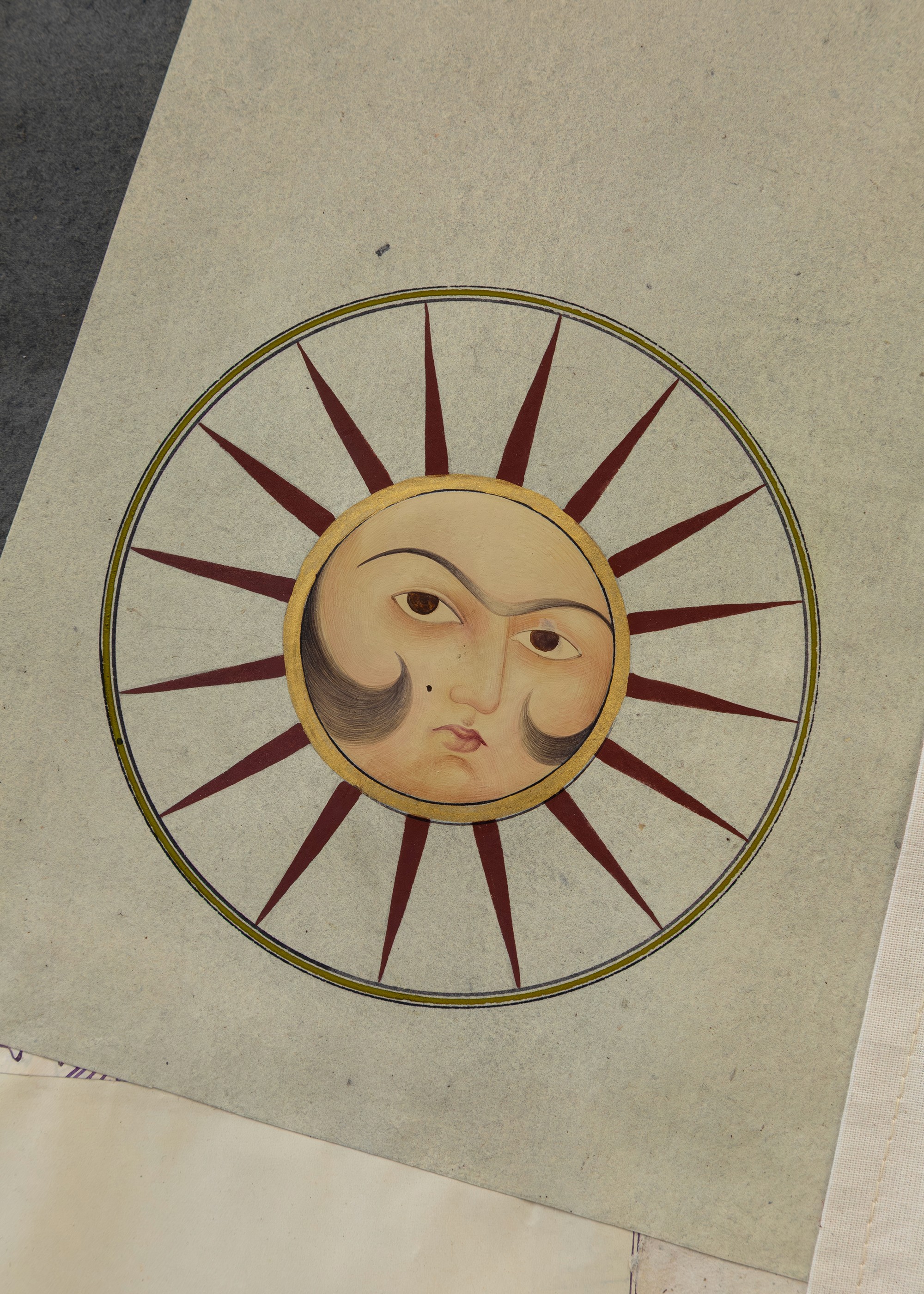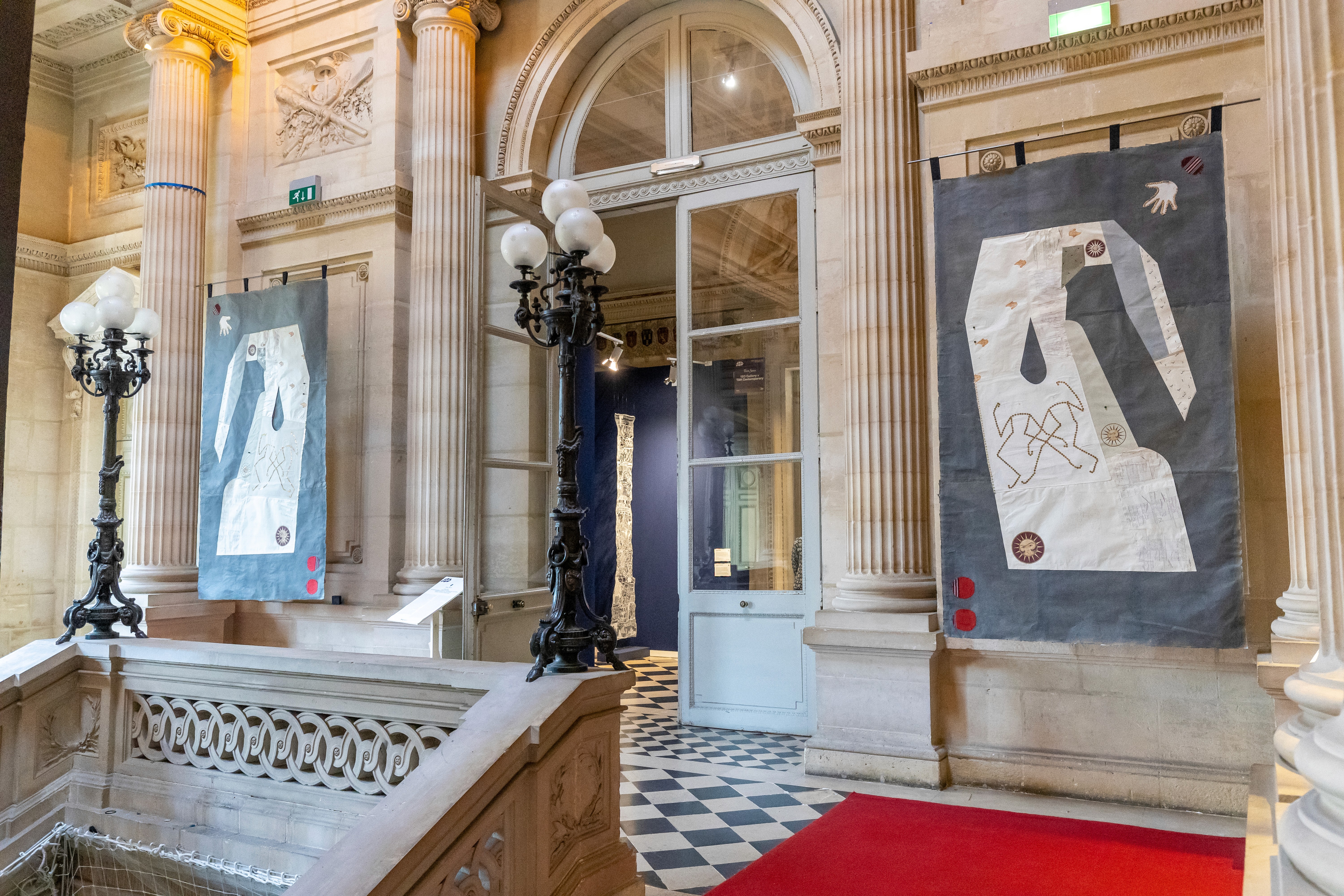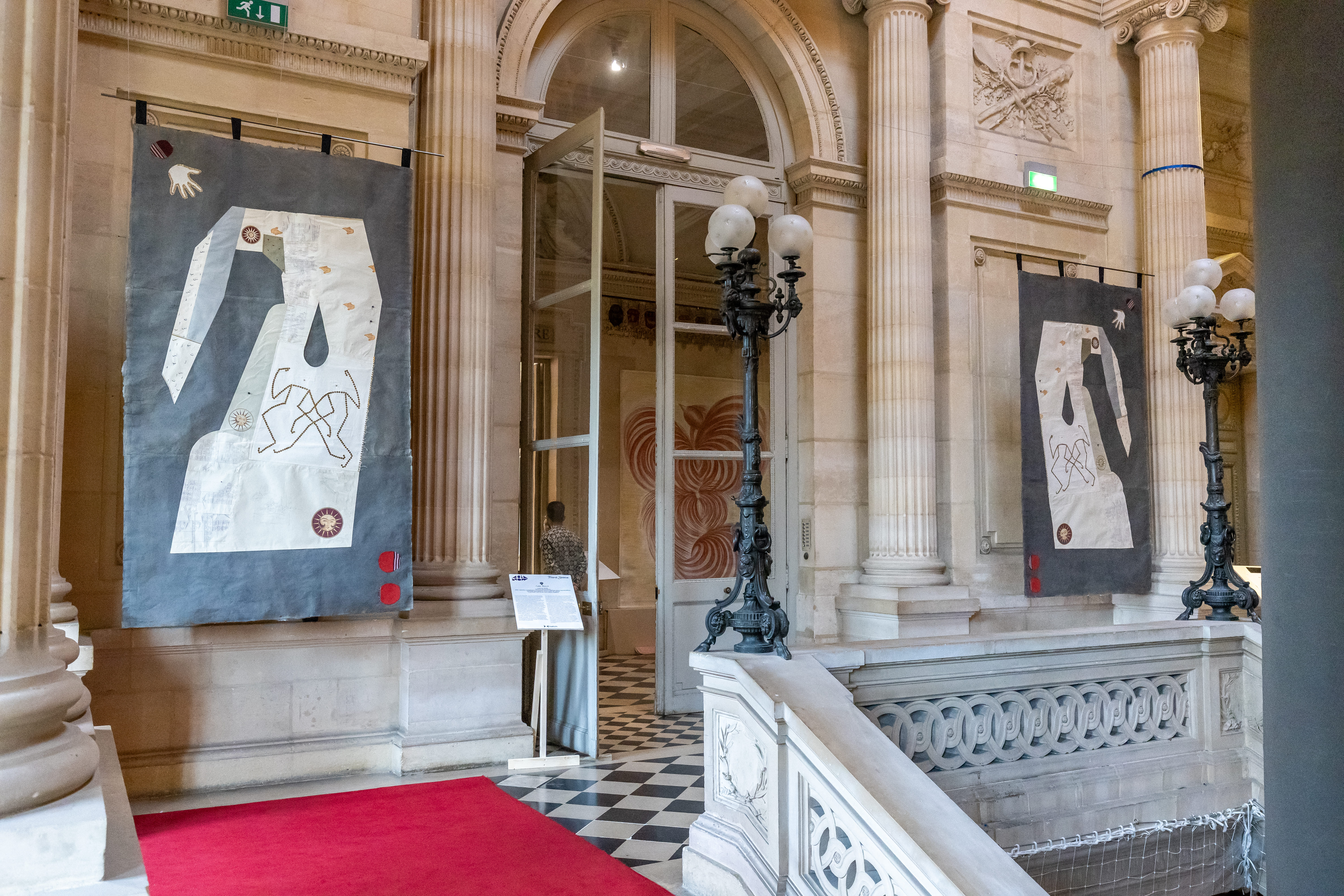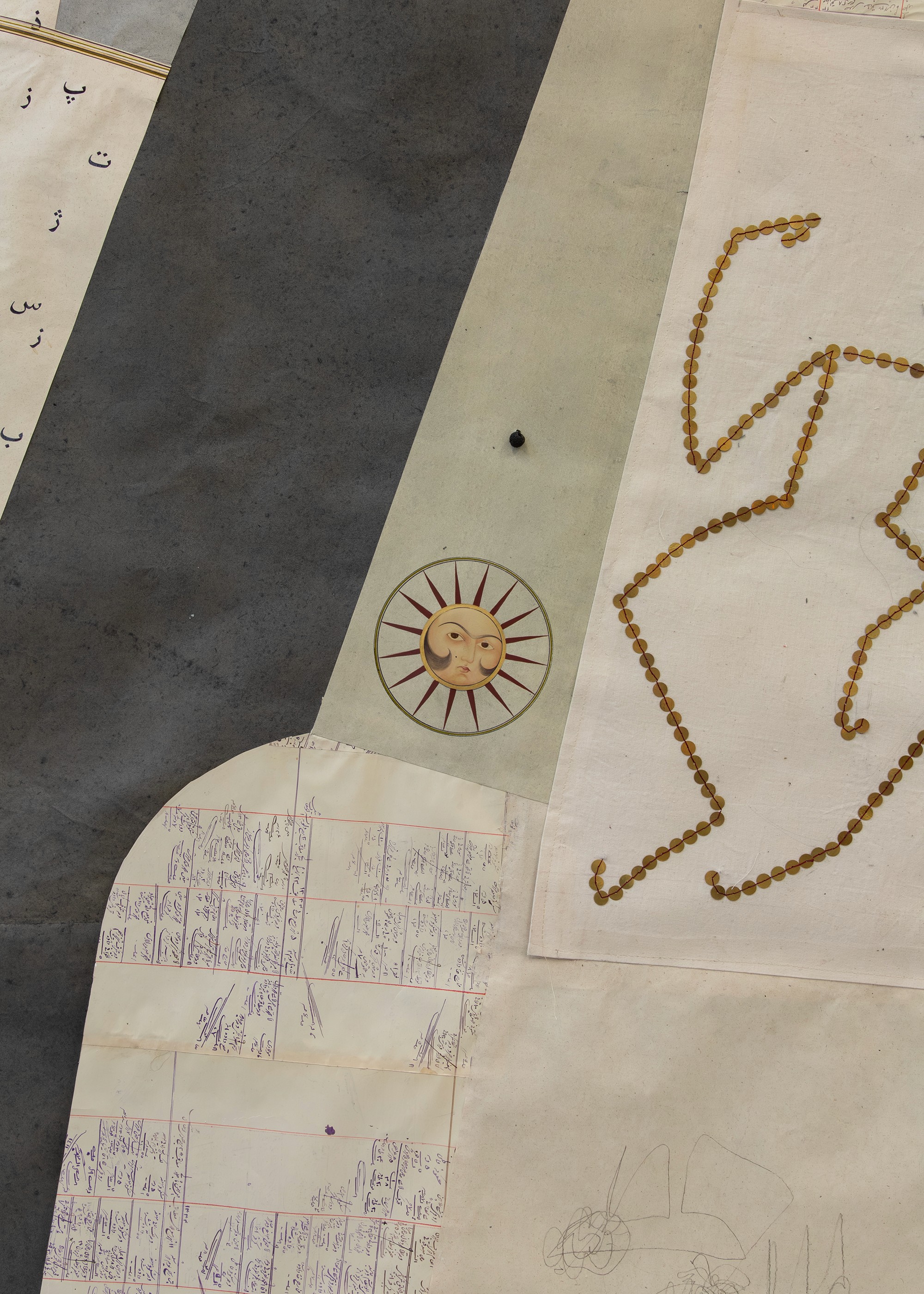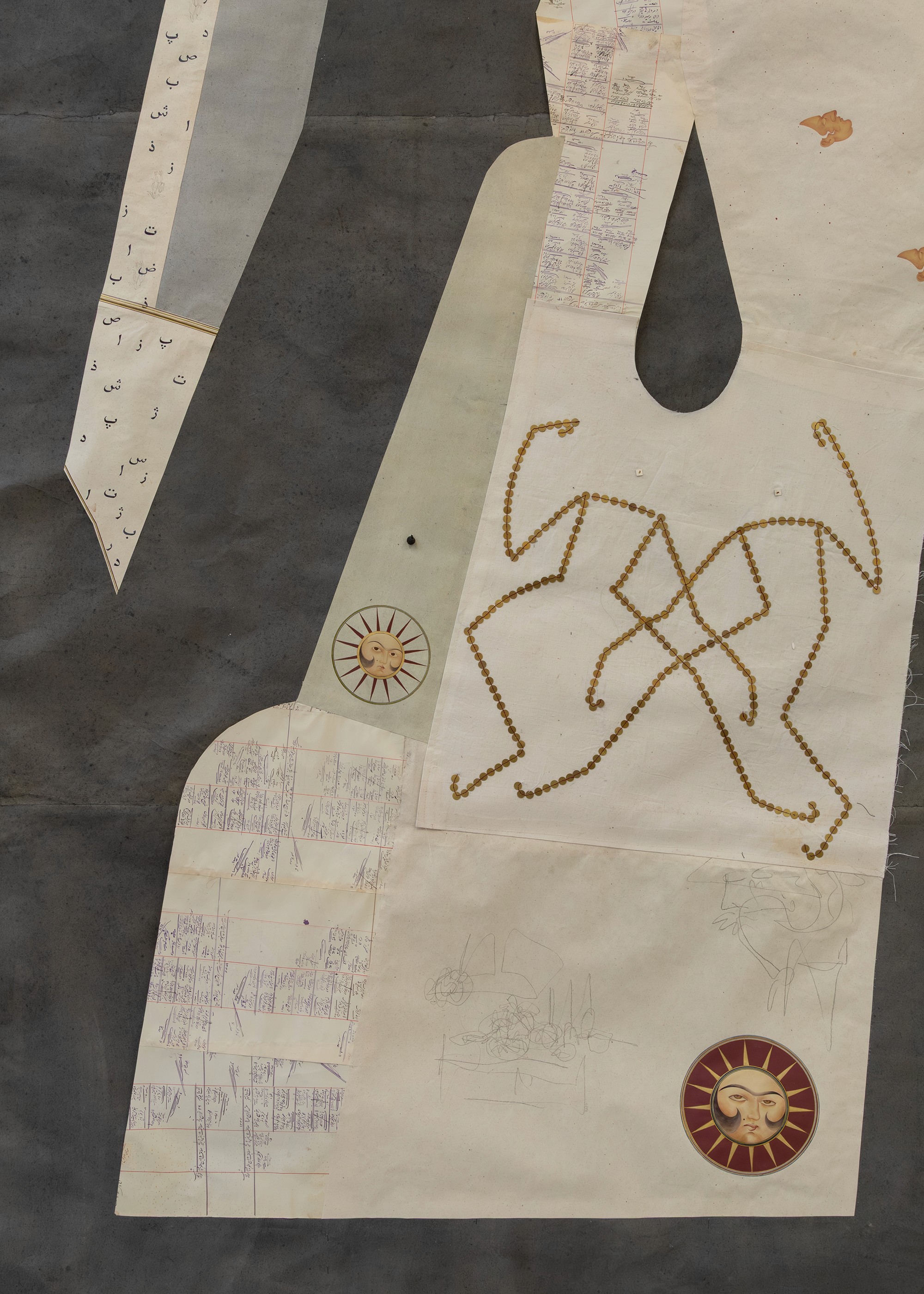 Situated at the top of the grand staircase, the kaftan is split into two sections through which visitors must pass to access the fair and the project presented on the upper floor. Its two halves articulate exterior display and interior residue, while the sound piece binds them into a single spatial argument. The fabric surface performs the nation through a bold, celebratory assemblage of reconstituted textiles, poulak-douzi embroidery, cut-outs, and sequined letters and bodies treated as semiotic forms. The paper surface serves as the documentary underside, composed of handmade papers, pre-revolutionary debt ledgers, newspaper cuttings, and volcanic pumice, marked with memory drawings, hieroglyphic letters, and miniature painted figures. Together, these facing conditions, public and ceremonial versus private and archival, establish the work as both passage and threshold.