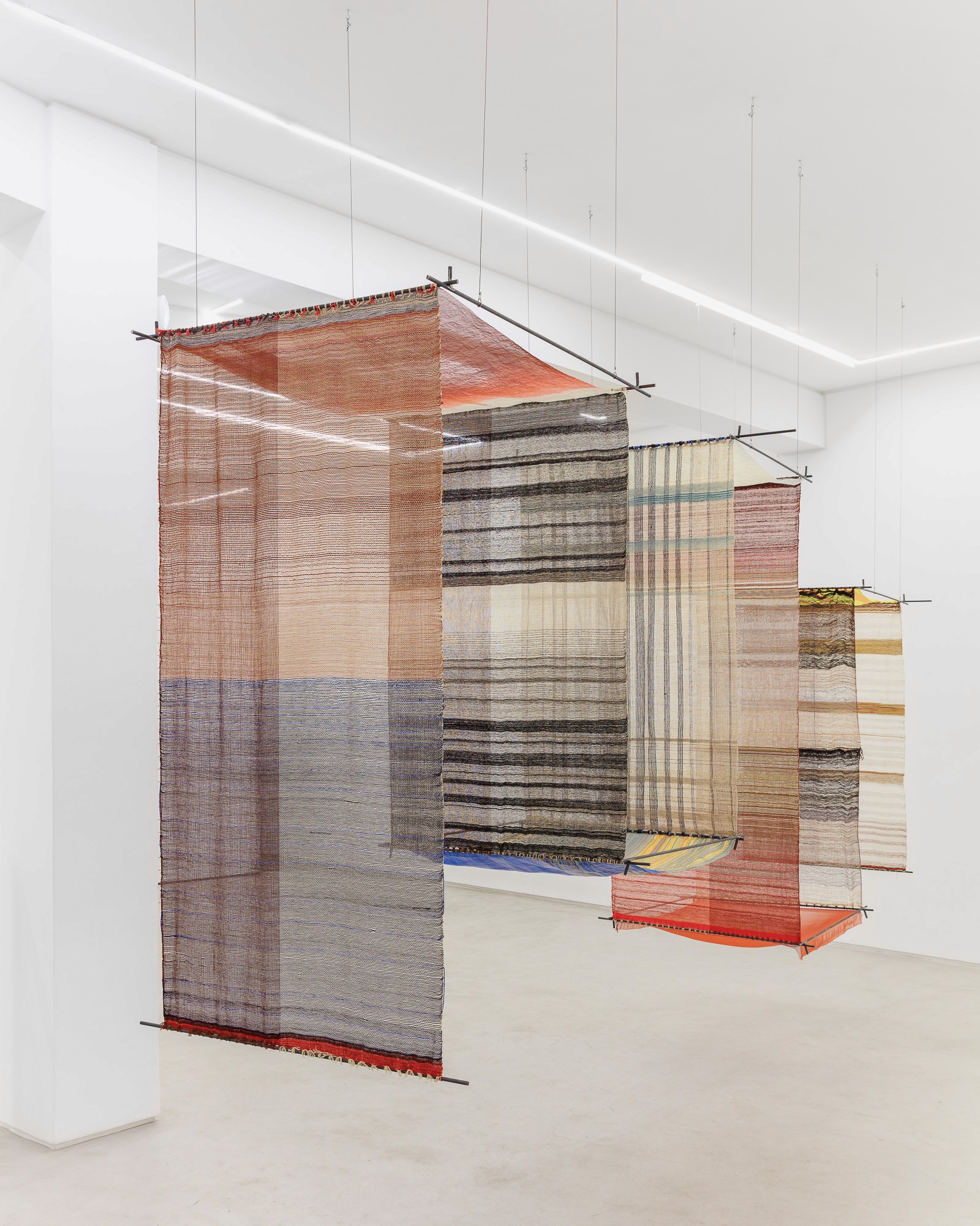 What Holds The Structure is Maria Appleton’s second solo presentation at Galeria Foco. Through acts of weaving, un-doing, and re-use, the artist, materially and conceptually questions the notion that life is made-up-of and upheld by neatly intersecting threads. Rather, Appleton suggests that events follow an uninterrupted unfolding, made up of shifting perspectives, which incorporate knots and are shaped by loss, in the form of gaps, opacities or voids in the weave. The title of the exhibition at once asks and declares that there is a thing behind all things, including structure, which holds everything in a chaotic balance that is beyond our comprehension, yet within haptic reach.
