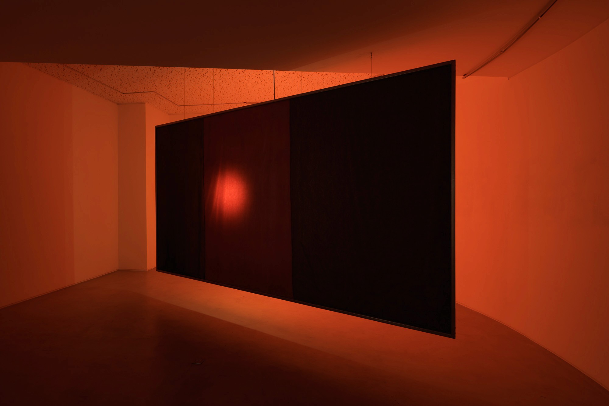 By way of conclusion, the lower floor of the gallery conceals an almost crescent-shaped room which Appleton has reserved for Intuiton, a feeling that can sometimes be asymptomatic, unless acknowledged and embraced from the inside out. For the artist, this sense of sorts is the highest form of knowledge a person can develop. The work’s layered fabrics, understood as visceral, membrane-like barriers, conceal an internal lighthouse, located somewhere between the stomach and the throat.